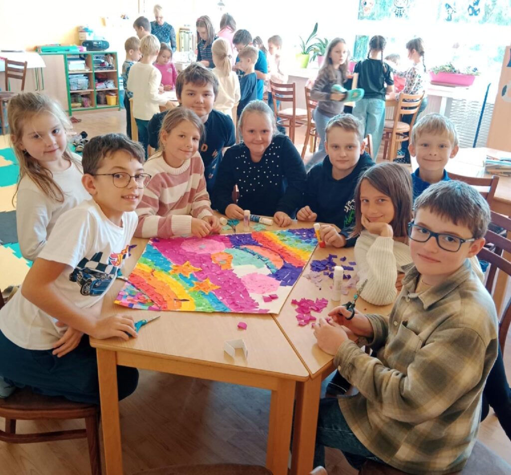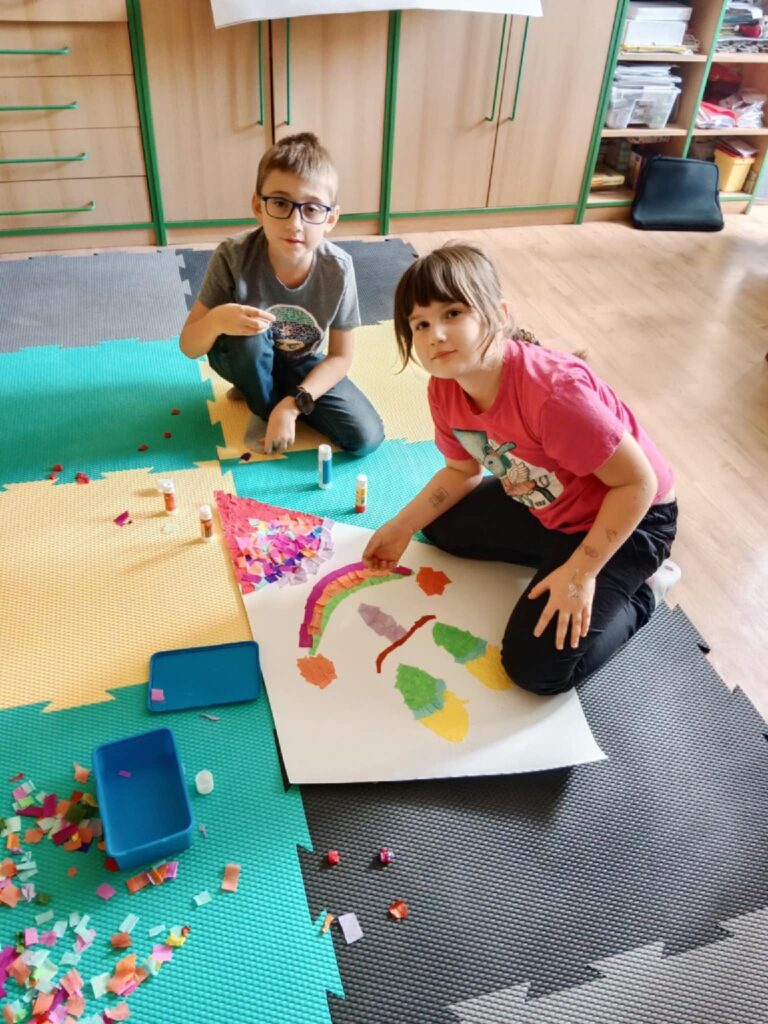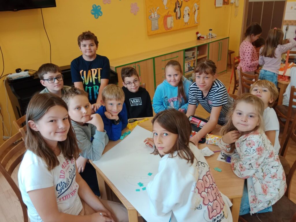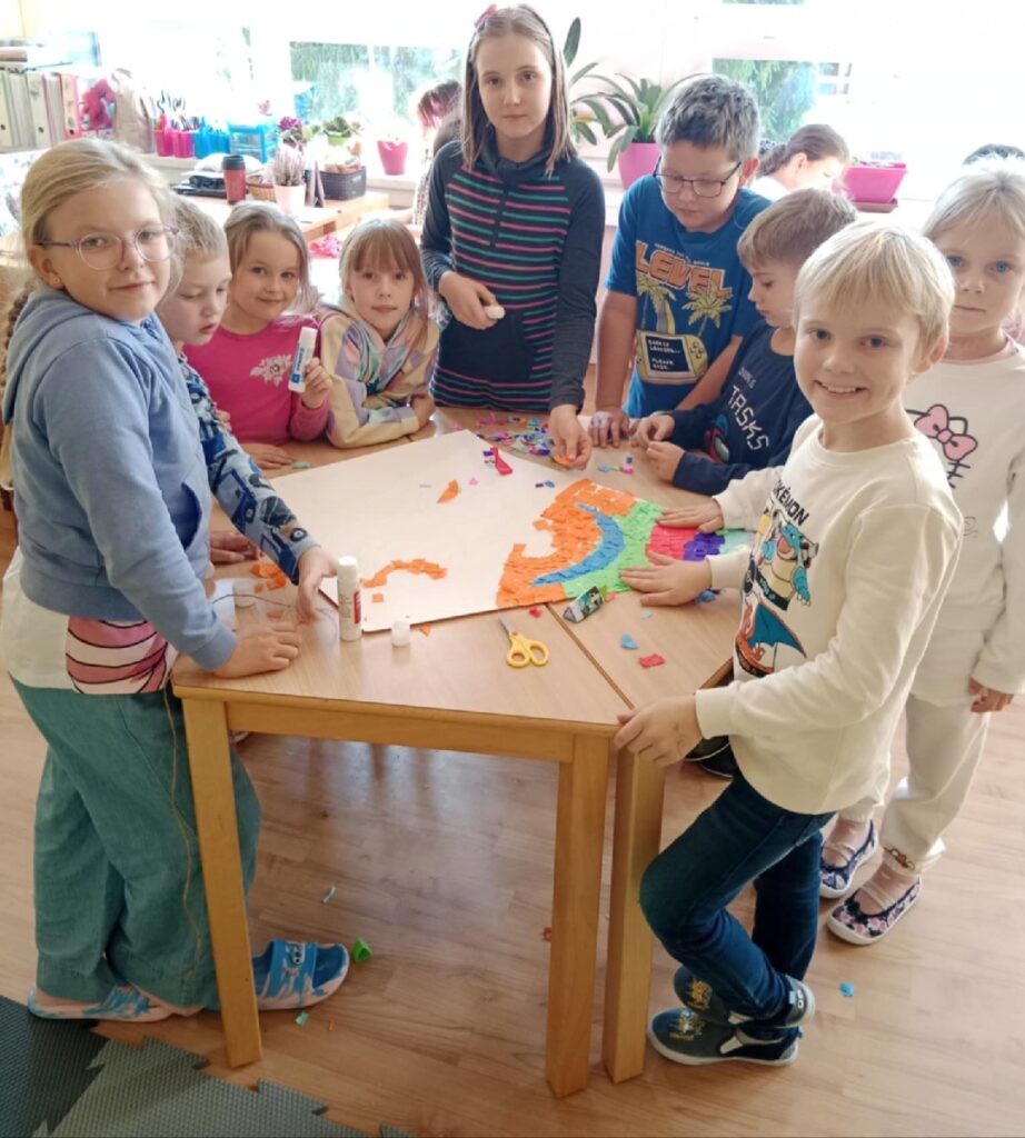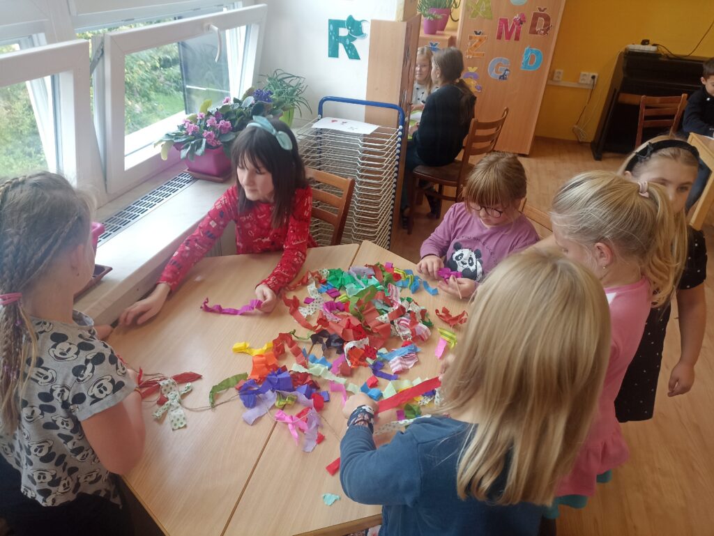 Na dracích děti pracovaly technikou trhání a lepení kousků krepového papíru, což byla práce sice titěrná, ale velmi barevná a kreativní. Tato činnost zároveň skvěle rozvíjela jemnou motoriku a trpělivost dětí, ochotu spolupráce a tvůrčí atmosféru. Naši draci se stali ozdobou prostor ŠD.