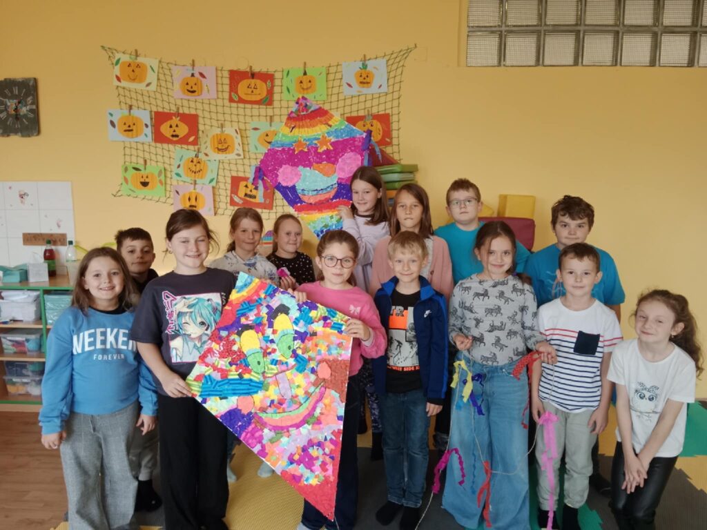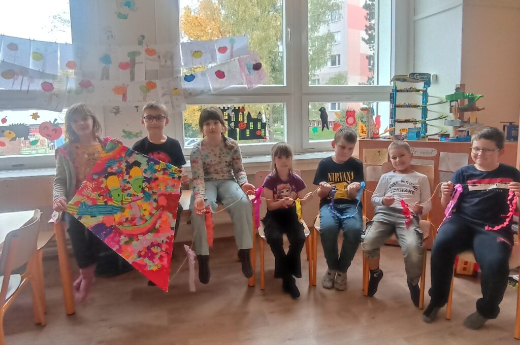 V rámci podzimní tematické činnosti se děti z 1. 4. oddělení rozdělily do skupinek, ve kterých společně pracovaly na tvorbě velkých podzimních draků – jejich výška dosahovala téměř velikosti prvňáčků!