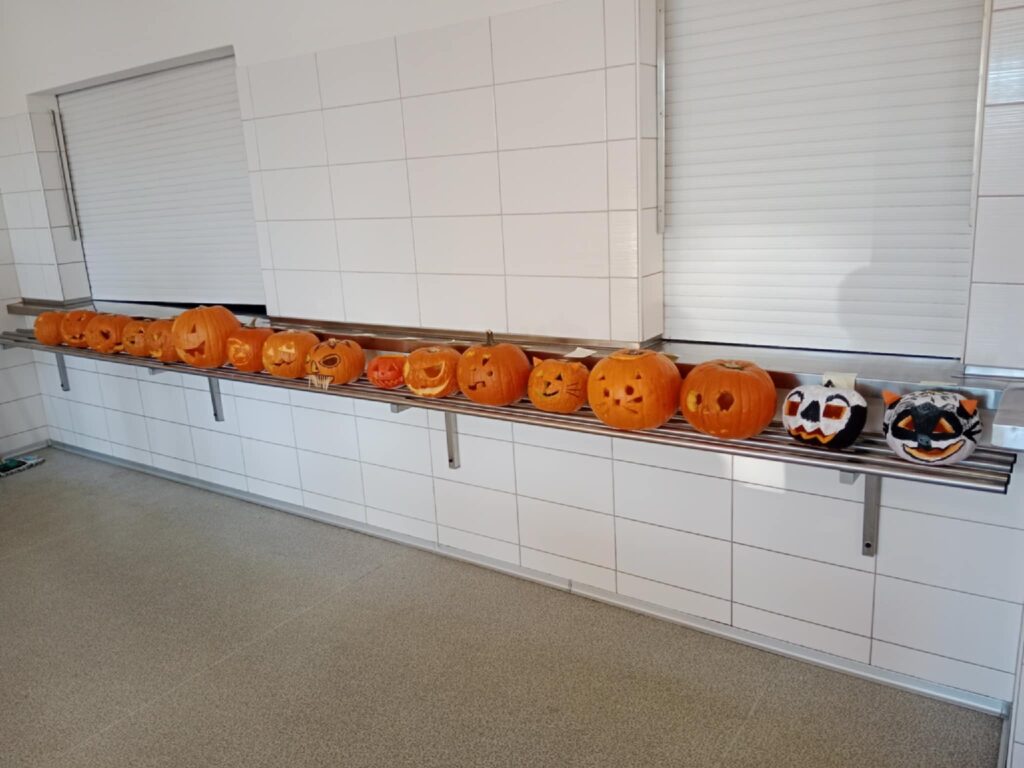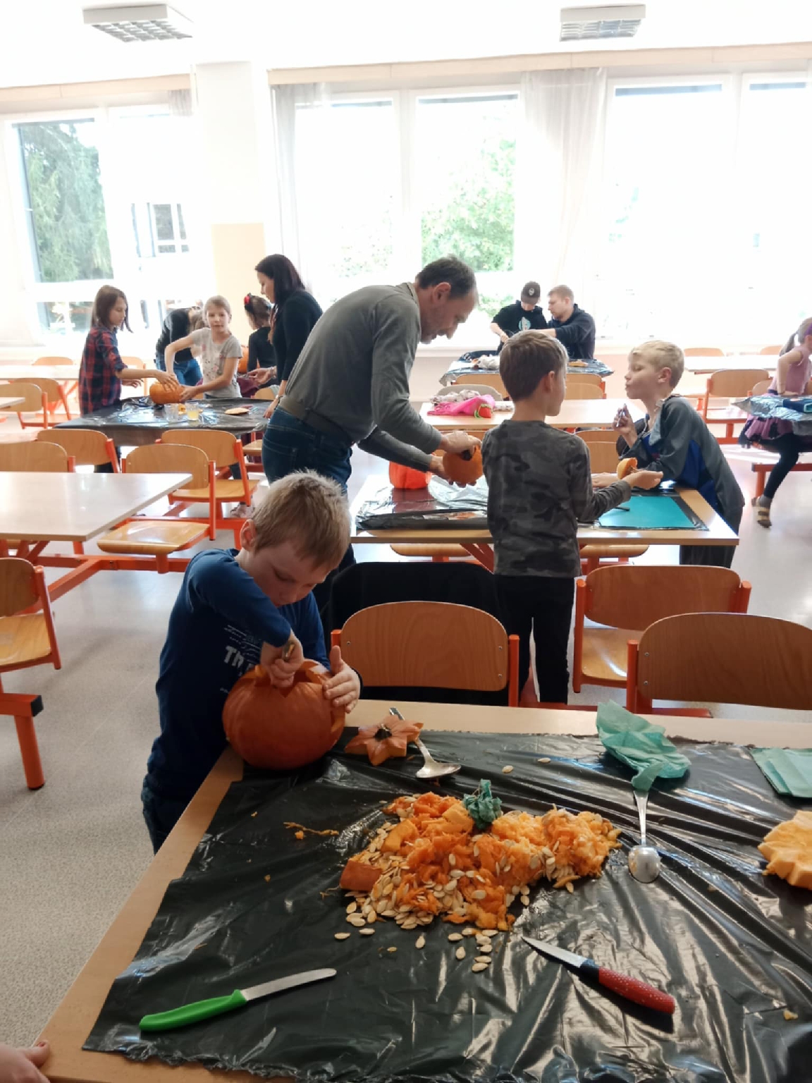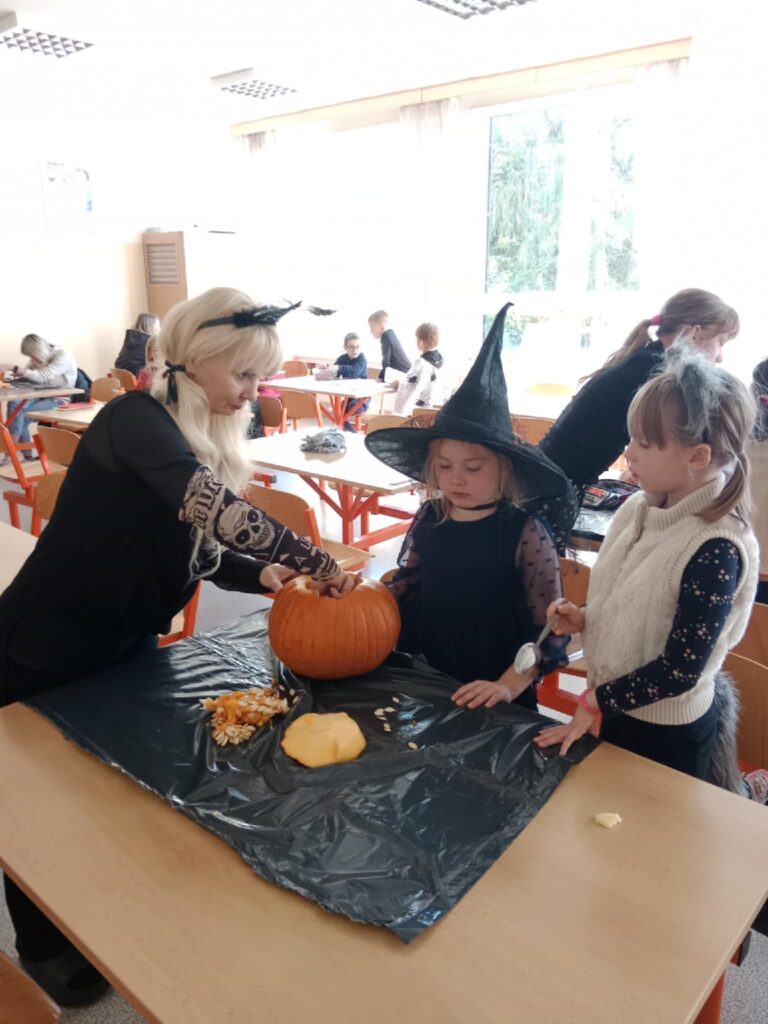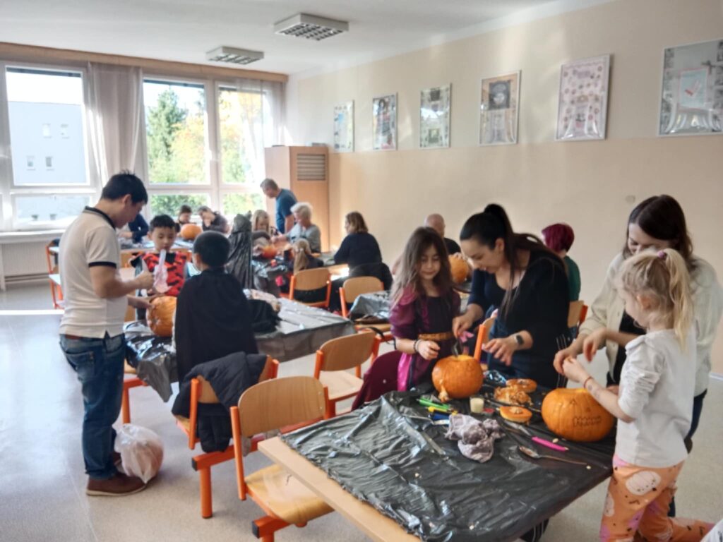S koncem října se přiblížilo naše tradiční dýňování. I když Halloween není původní český svátek, jeho obliba u dětí stále stoupá. Proto školní družina připravila halloweenský foto koutek v prostorech hlavního vchodu školy, tak i v mimoškolním pavilonu. 20. 10. 2025 družina uspořádala ve školní jídelně 13. ročník tradičního dlabání dýní. Letošní akce měla veliký ohlas a hojnou účast. Kdo pěstuje dýně ví, že tato zelenina je zaručeným zahrádkářským úspěchem svou velikostí i množstvím. Sešly se nám tedy dýně rozmanitých tvarů. Děti podporovány svými radiči a příbuznými se pustily do nádherných dýňových kreací. Vůni oranžové dužiny, doplnila vůně stylově oranžového a zdravého mrkvového moučníku našich paních kuchařek. Děkujeme jim tímto i za pomoc s přípravou. Některé děti přišly v halloweenských maskách z domova, jiné si masky vytvořily ve školní družině. Všechny děti, které tvořily z dýni nebo využily výtvarného koutku a dílničky dostávaly odměnu. Dýňové lampičky jsou vystaveny v prostorech školy, kde navazujeme spolupráci s 1. stupněm a školní soutěží O nejkrásnější halloweenskou dýni.
