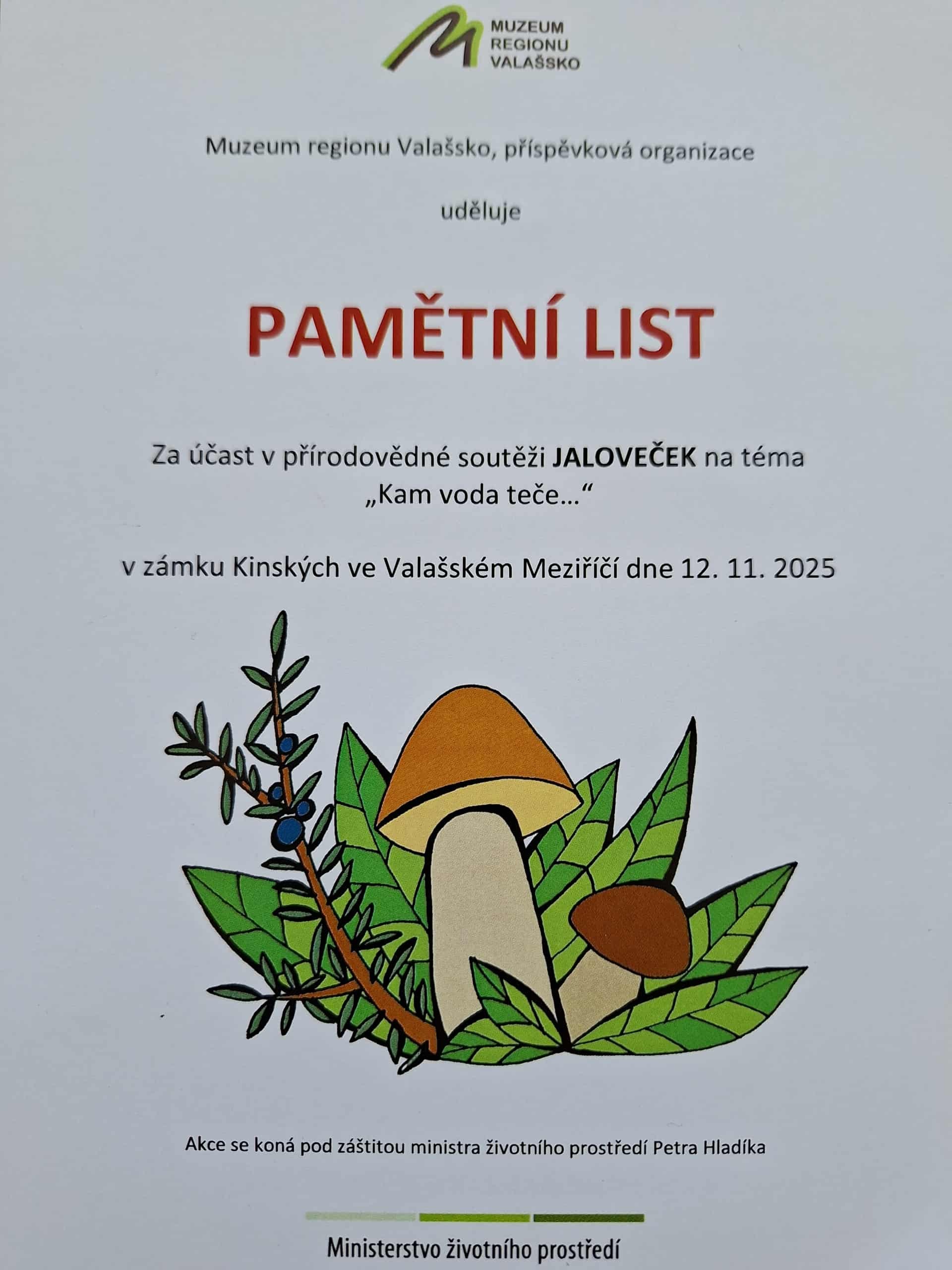 Dne 12. 11. 2025 se vybraní žáci 8. ročníků zúčastnili soutěže Jaloveček s přírodovědnou tematikou na zámku Kinských ve Valašském Meziříčí. Akce se konala pod záštitou Ministerstva životního prostředí. Naši školu z 8. B reprezentoval tým: ,,Letouni“ v zastoupení Aničky Juřicové, Valentýnky Danišové, Toma Jiříčka a Lubomíra Baláže.
