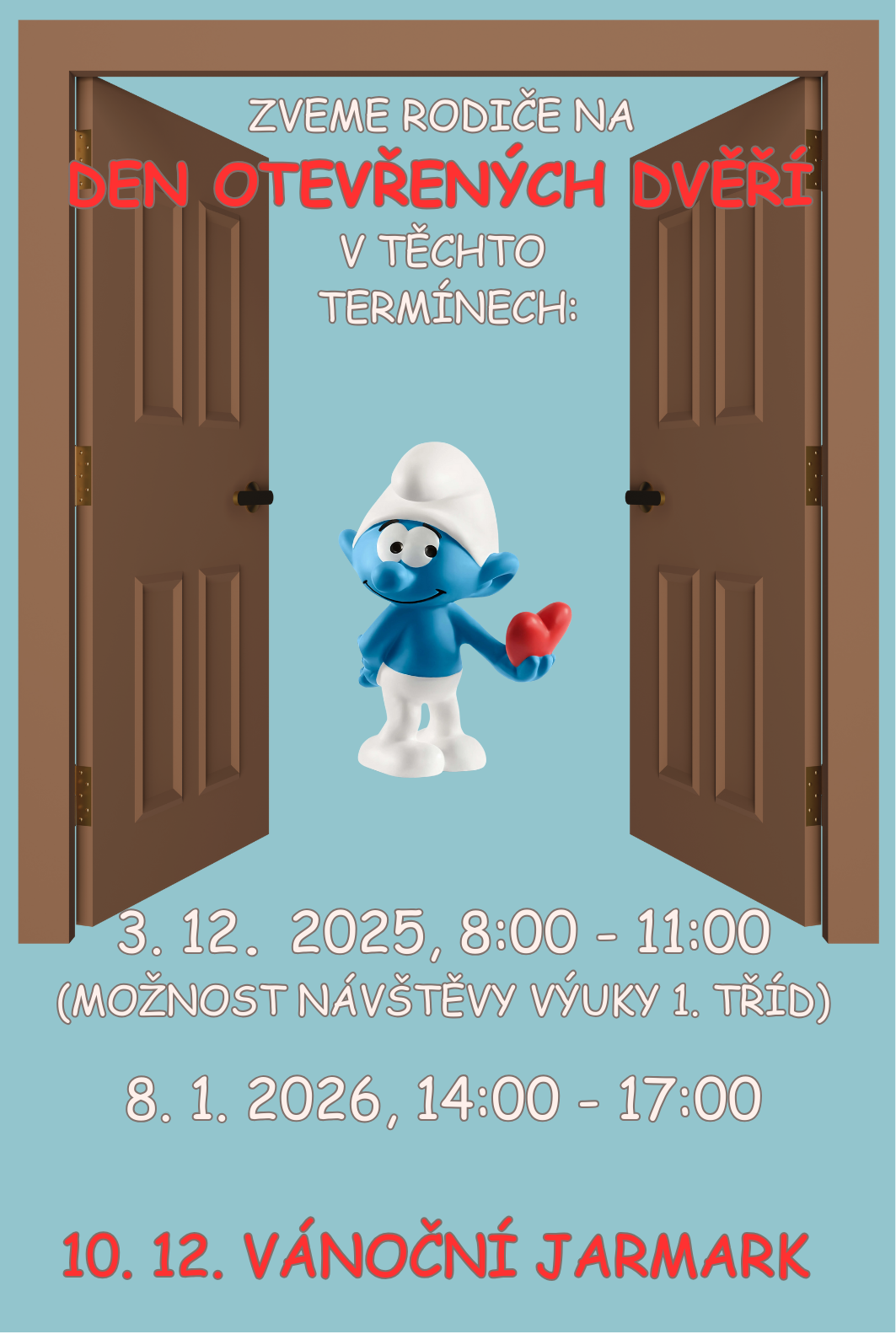 Ve středu 3. 12. 2025 od 8 do 11 hodin zveme rodiče na den otevřených dveří s možností navštívit výuku v prvním ročníku.