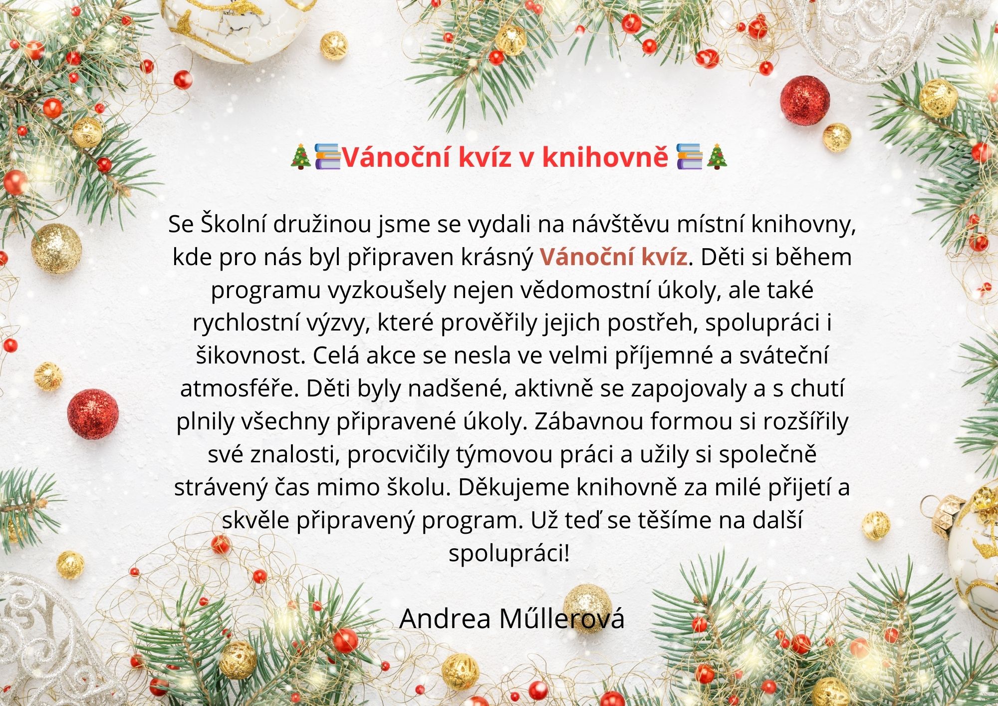 Se Školní družinou jsme se vydali na návštěvu místní knihovny, kde pro nás byl připraven krásný Vánoční kvíz. Děti si během programu vyzkoušely nejen vědomostní úkoly, ale také rychlostní výzvy, které prověřily jejich postřeh, spolupráci i šikovnost. Celá akce se nesla ve velmi příjemné a sváteční atmosféře. Děti byly nadšené, aktivně se zapojovaly a s chutí plnily všechny připravené úkoly. Zábavnou formou si rozšířily své znalosti, procvičily týmovou práci a užily si společně strávený čas mimo školu. Děkujeme knihovně za milé přijetí a skvěle připravený program. Už teď se těšíme na další spolupráci!